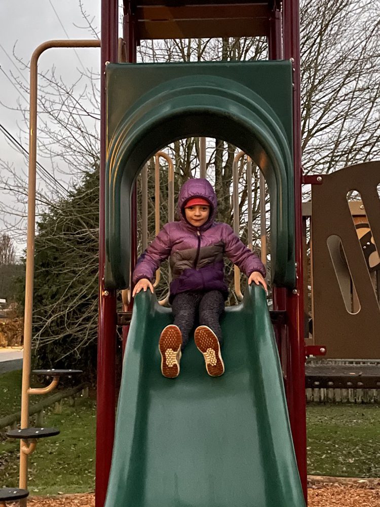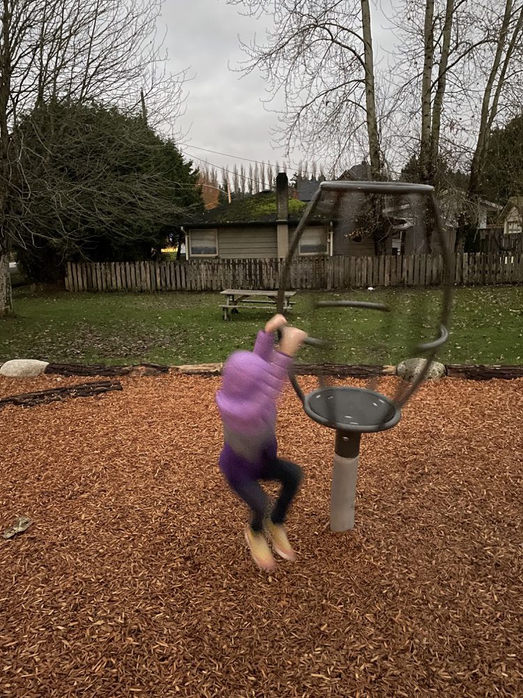 On the monkey bars I swing back and forth. On the slide gravity pulls me down.